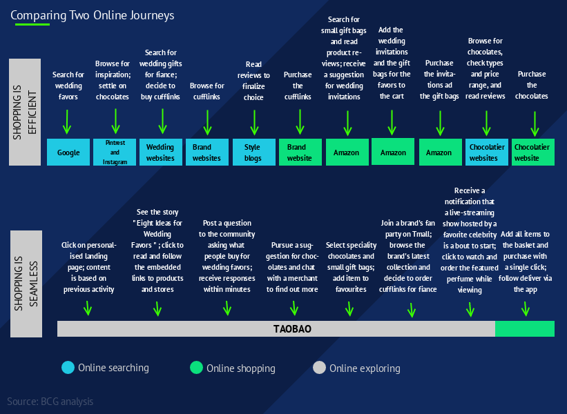 In contrast, e-commerce platforms in China are designed to provide a rich and unique experience. Shopping online is seen as an adventure: mixing social, entertainment, and the purchasing experience where consumers take their time and explore – just as they would if they were strolling through a mall with friends and family.